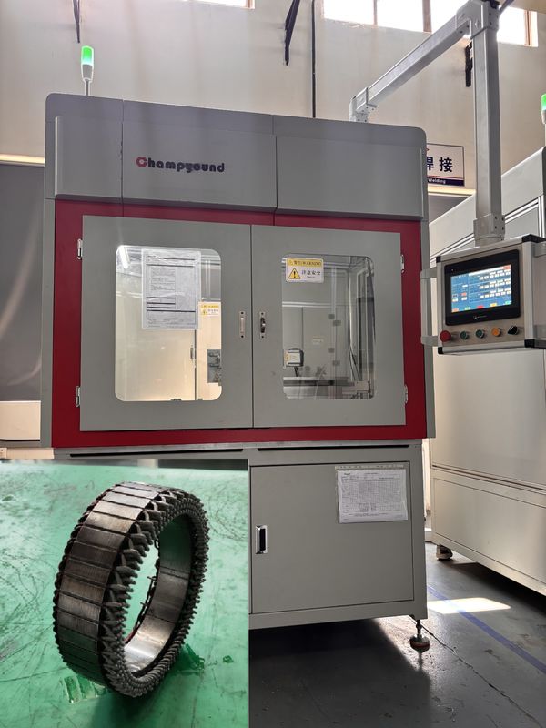 This machine is part of Champyound's comprehensive motor stator production line, which includes wire forming, press-in, widening, head twisting, flat cutting, and welding machines. Each unit operates independently or can be integrated with conveyor systems.
